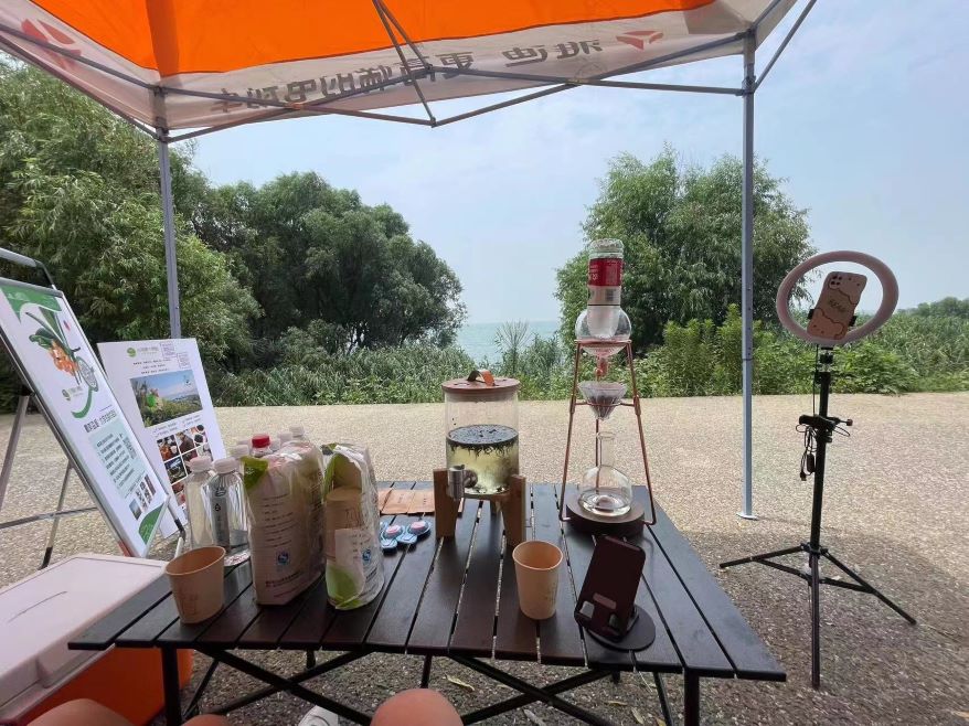 與上次不同的是,這次團隊成員將茶葉用當地生產的泡茶專用泉水泡好后放在玻璃罐中進行線下擺攤與線上直播。擺攤地點選在了太湖景區入口處。此處面向太湖,風景宜人。
