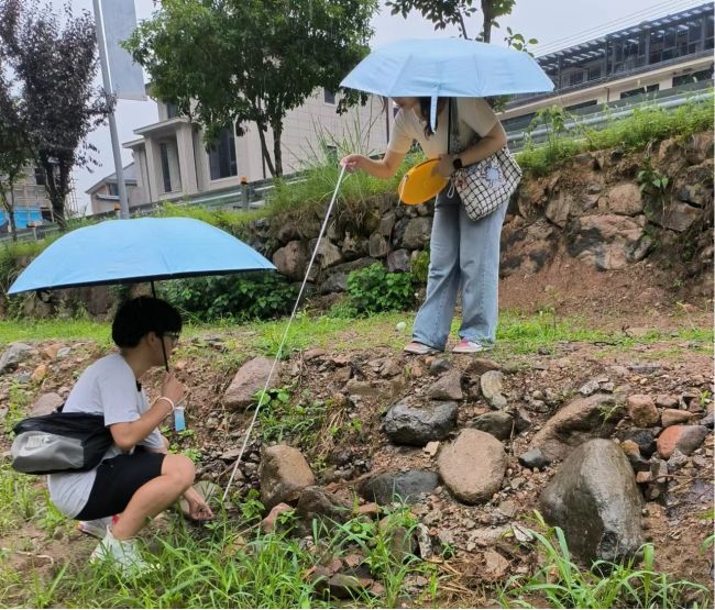 船村溪沿岸也是本次設計的核心點位。在勘測場地之時,正逢綿綿細雨,團隊成員不畏艱苦,通過全數字近景攝影測量技術與卷尺測量相結合的方式獲取數據,通過重復測量得到多組數據,減少數據誤差。團隊成員以嚴謹求實的態度和“三干”精神在丈量點位,盡可能得到準確的數據,做出精準的設計圖,為后期船村項目落地提供更可靠的方案。