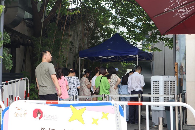 圖為團隊成員對南長街圣塘里新入駐的茶顏悅色門口排隊顧客進行問卷調查。