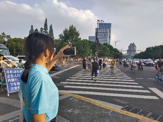 下午實踐團隨機尋找市民發放調查問卷,對區域交通發展情況、日常通勤出行情況和擁堵情況進行調查,對市民對當前交通發展現狀滿意度和通過激勵轉變路權使用的意愿等信息提前設定問題進行收集,進行統計分析。