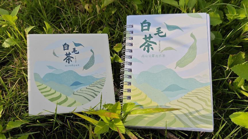 白毛茶文創周邊設計理念 本以打造地方品牌為核心的內涵導向,注重中式茶文化的傳播與創新,故設計一款年輕、簡約、極具特色的大源白毛茶系列文創。文創插畫運用特殊水彩筆刷,以白、綠、藍三色,奠定畫面清新淡雅的色彩基調。畫面圖形元素抓住大源鎮獨特高山地勢與云霧環繞的環境特點以及白毛茶葉特征,緊繞“高山云霧”這一特點,描繪出大源鎮白毛茶葉的獨特自然生長環境,設計出符合現代審美需求的白毛茶系列文創。文創產品整體視覺觀感上傳達出風雅、清新的審美特點,從而加深消費者對大源鎮白毛茶的印象認知,達到推廣大源鎮白毛茶品牌特色的目的。