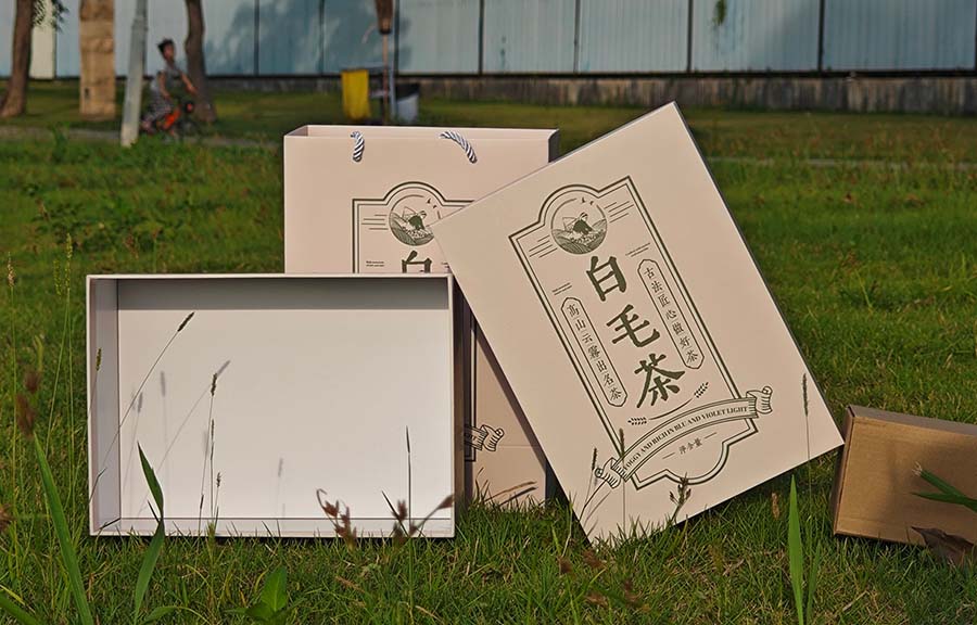 白毛茶茶盒設計理念 茶盒正面畫面排版采用中軸對稱式構圖,在傳統茶盒的設計基礎上推陳出新,利用黃、綠二色奠定畫面沉穩古樸的色彩基調,融入茶農手工采茶的場景元素,緊緊圍繞“高山云霧出名茶,古法匠心做好茶”這一概念,從而設計出緊貼大源鎮白毛茶文化特色的白毛茶盒。茶盒實體制作為天地蓋,質感高級,開啟具有儀式感,有利于提升茶葉產品形象,打造大源鎮白毛茶品牌獨具特色的茶葉形象。