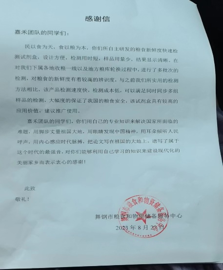 最后,嘉禾團隊將產品介紹給舞鋼市糧庫的工作人員們,他們將試劑盒推廣到全市各地的地方糧所和收糧一線中進行實地檢測應用,經過一個月的實地檢測應用,各個試用點反饋效果良好,舞鋼市糧食和物質儲備局后還給嘉禾團隊致以一封感謝信,高度評價我們這次暑期三下鄉社會實踐活動,他們評價我們的試劑盒,節省了人力,物力,具有先進的技術水平和廣泛的應用前景。