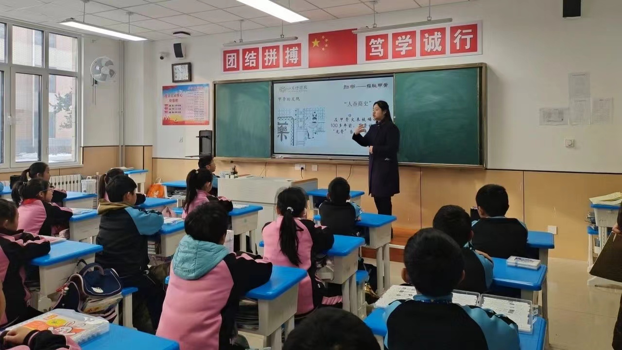 一組實(shí)踐隊(duì)員走進(jìn)福山區(qū)崇文街小學(xué),采用PPT介紹甲骨文的發(fā)現(xiàn)過(guò)程和歷史背景,讓學(xué)生們了解甲骨文的重要性,與學(xué)生們共同討論甲骨文的起源以及了解甲骨文在商朝時(shí)期的使用情況和用途,如占卜、祭祀、記錄等,講述甲骨文在當(dāng)時(shí)社會(huì)的重要作用。實(shí)踐隊(duì)員還精心策劃制作的甲骨文字視頻,圖文并茂、內(nèi)容豐富,吸引孩子們沉浸其中。