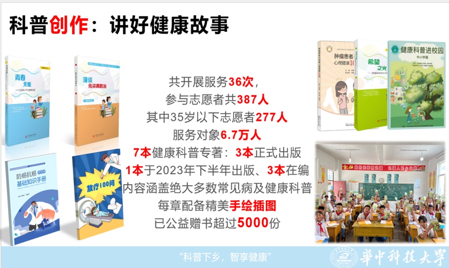 大學(xué)生快樂科普驛站的活動(dòng)始于新冠肺炎初期,于2020年11月21日正式建群,以華中科技大學(xué)同濟(jì)醫(yī)學(xué)院的醫(yī)學(xué)生為主力軍,醫(yī)生,護(hù)士,健康相關(guān)工作者同樣參與進(jìn)行科普,隊(duì)員跨越18個(gè)院系,下至本科生上至博士生,來自多種專業(yè)、不同科室,形成“醫(yī)學(xué)+”多學(xué)科特色。導(dǎo)師團(tuán)隊(duì)由三甲醫(yī)院主任醫(yī)師及高校教授組成,師生發(fā)揮團(tuán)隊(duì)效應(yīng),以云調(diào)研、云課堂、實(shí)地宣講、實(shí)地走訪等形式,開展了多場社會影響力強(qiáng)、群眾參與度高的線下、線上實(shí)踐活動(dòng)。團(tuán)隊(duì)開展志愿服務(wù)三年,編撰7本健康科普專著,內(nèi)容涵蓋絕大多數(shù)常見疾病,公益捐贈(zèng)超5000本。團(tuán)隊(duì)成員利用寒暑假奔赴全國各地,從彩云之南到荊楚大地,在鄉(xiāng)村學(xué)校進(jìn)行健康科普教育, 努力提升青少年健康素養(yǎng),助力健康中國與鄉(xiāng)村振興戰(zhàn)略。