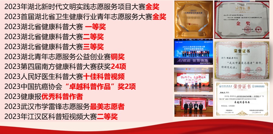 團(tuán)隊(duì)承接國家培訓(xùn)項(xiàng)目 1項(xiàng),60余篇科普文章、教學(xué)論文、調(diào)研報(bào)告在正式期刊上發(fā)表。科普中國-大學(xué)生科普驛站賬號躍居湖北省內(nèi)第6位,網(wǎng)媒報(bào)道團(tuán)隊(duì)300余次,引起廣泛關(guān)注。團(tuán)隊(duì)參與創(chuàng)造的優(yōu)秀醫(yī)學(xué)科普作品參與各大科普競賽,如協(xié)和醫(yī)院健康科普大賽、湖北省科普大賽、健康中國科普大賽、南方健康科普大賽、中國抗癌協(xié)會科普大賽等,獲獎(jiǎng)50余次。
