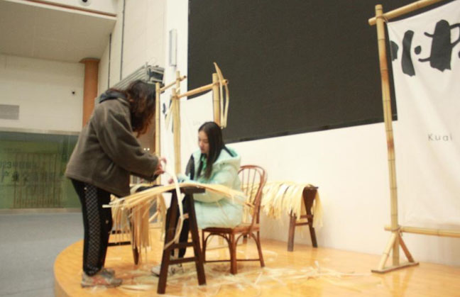 (圖二 本地竹藝人向隊員演示編織技術(shù))