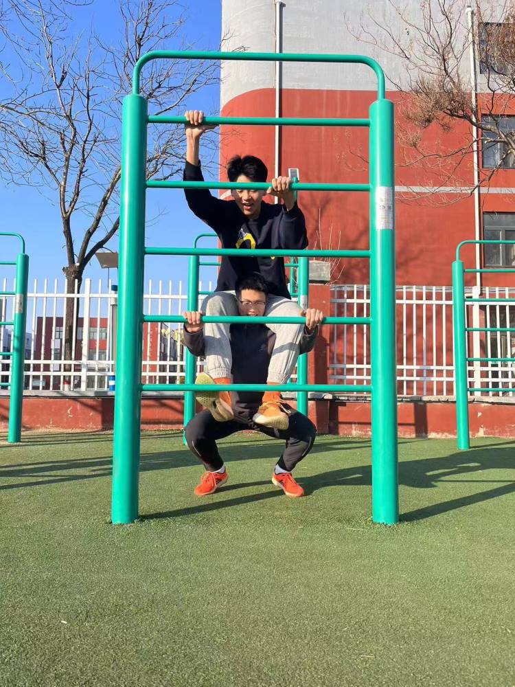 實踐隊員為了鞏固步幅步頻練習,使百米成績得到有效提高,運用皮帶進行髖關節發力練習。圖中兩名學員相互配合,為了使學員更容易感受髖關節的發力,用皮帶捆綁在學員的腿上,使學員更加清楚地感受髖關節的發力,以此來鍛煉髖關節的靈活性。張杰同學認為在跑百米的過程中髖關節發力是一個很重要的步驟。髖關節起到一個送髖的作用,使我們的步幅更大。