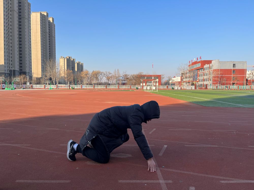 圖中實踐隊員在山東省德州市慶云縣全民健身廣場為學員示范起跑動作,張杰同學說:“在教學時,不能只對學員進行講解動作,還要靈活運用“講解示范法”,在講解的過程中進行示范,讓學員更容易理解。”在起跑時要注意兩手撐地,拇指相對,兩腳依次蹬在起跑器上,四點著地。聽到 “預備” 口令時,后腿膝蓋離地,臂高于肩,中心前移,肩部超于起跑線。聽到“跑”的口令,兩臂迅速擺動,兩腿左右用力蹬地。通過這些動作要領,張杰同學逐一去糾正學員們的錯誤動作,并幫助改正,使學員們運用正確的起跑動作,以此來提高百米成績。