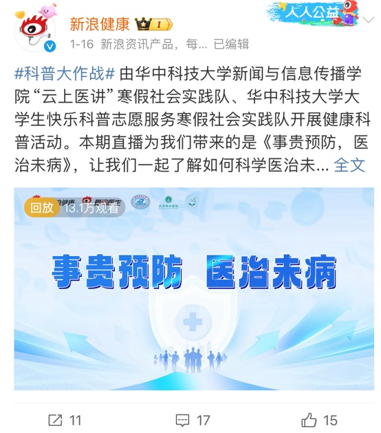 習近平總書記在中共中央政治局第三次集體學習時強調,要加強國家科普能力建設,深入實施全民科學素質提升行動,線上線下多渠道傳播科學知識、展示科技成就,樹立熱愛科學、崇尚科學的社會風尚。為深入貫徹黨的二十大精神,推動科普成果共創共享,形成校園和社會的有效互動,提升全民健康素質,2024年寒假期間,來自華中科技大學新聞與信息傳播學院、基礎醫學院、醫藥衛生管理學院、社會學院、人文學院等多個學院的同學組成的“云上醫講”寒假社會實踐隊,攜手大學生快樂科普志愿服務寒假社會實踐隊,在新浪健康提供的平臺“愛問醫生”微博及微信視頻號上開展線上科普系列講座。