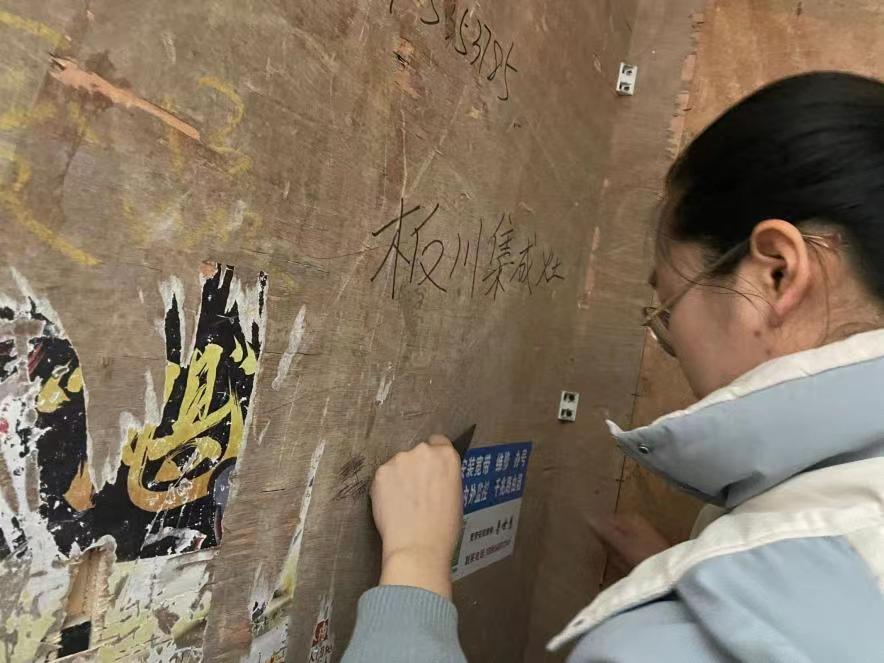 圖為實(shí)踐隊(duì)員正在努力清楚社區(qū)墻上胡亂張貼的小廣告。中國青年網(wǎng)通訊員 潘宇琪 攝