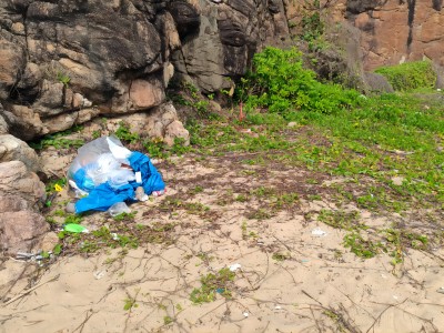 調研如火如荼的進行,團隊成員于1月27日上午深入探訪了富力灣濱海公路景區沙灘。該沙灘面積廣闊,地形復雜,礁石遍布,并伴有陡峭的山坡,其周邊被茂密的灌木和沙草所覆蓋。在該時段,沙灘游客數量較多,垃圾分布密度也相對較高,尤其在靠近內陸區域更為顯著。常見的垃圾包括飲料瓶、零食袋等游客遺留的廢棄物。特別值得注意的是,在兩處陡峭石縫中發現了大量垃圾殘留,垃圾種類繁多,包括煙頭、飲料瓶、紙巾、一次性餐具、零食袋、紙箱、廢舊衣物以及煙花爆竹等生活垃圾。經過細致分析,煙頭和飲料瓶占據了垃圾總量的約50%,成為沙灘垃圾的主要來源。此外,各類塑料制品,尤其是包裝袋和廢品,占據了約30%的比例。玻璃制品和金屬類垃圾占比約為10%。