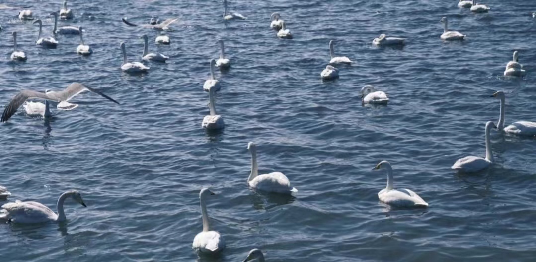 接下來是榮成天鵝湖,該湖位于榮成市成山鎮,東南兩面瀕臨渤海,四季分明,年平均氣溫11.8°C,屬中緯度溫帶季風性海洋氣候。湖內水質清潔明澈,沙灘純凈金黃,藍天碧水金沙灘,景色秀麗,氣候宜人。每年11月份至翌年4月份,萬只大天鵝、幾萬只野鴨、大雁不遠萬里,從西伯利亞、內蒙古等地呼朋喚友,成群結隊悄然降落,棲息越冬,被國內外專家學者譽為“東方天鵝王國”。