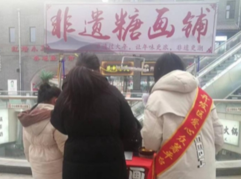 (圖為實踐隊員與非遺糖畫鋪老板聊天)
