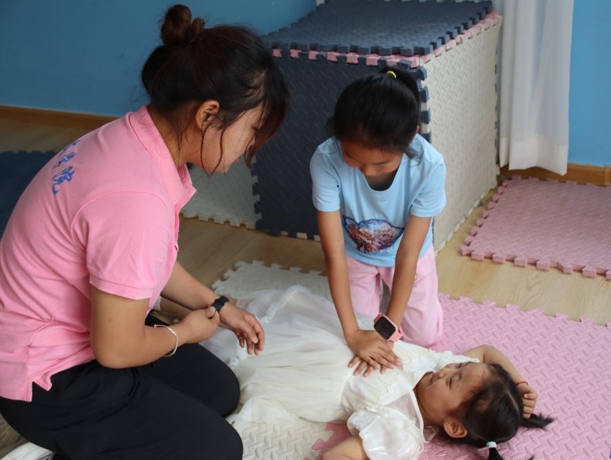 (圖為小朋友們學(xué)習(xí)心肺復(fù)蘇。張籃藍(lán)攝)