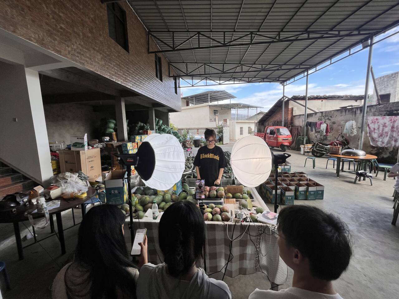 圖為鄉(xiāng)村振興促進(jìn)團(tuán)成員在芒果倉庫進(jìn)行現(xiàn)場直播 黃晶 攝