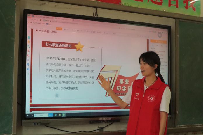 回到教室,志愿者們端坐教室,開展歷史文化宣講,在知識中,重走一遍“七七事變”,接受歷史的熏陶,通過認識參與抗戰的人物和故事研讀分享,我們穿越歷史,回到過去,接受最深刻的洗禮,在宣講中,我們更明白今日的和平來之不易,我們更應牢記歷史,用我們的方式做出回答,接住時代的接力棒。