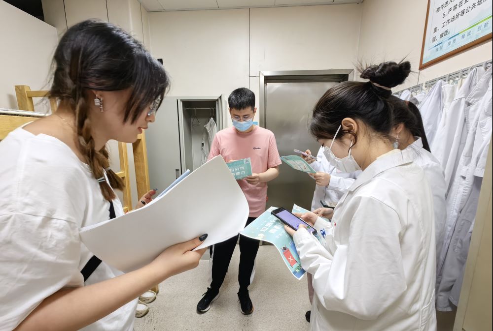 在淮安市第一人民醫院,實踐隊員成功與醫護工作者取得聯系,對其展開了現場采訪,主要了解了醫院垃圾分類實施的情況,并著重探討了醫療垃圾的分類方法。隨后在實踐隊員的指導下,醫護工作者們借助微信小程序現場體驗垃圾分類,并與實踐隊員分享使用心得。實踐隊員根據醫護工作者的使用體驗討論小程序改進措施,力圖通過現代科技手段,幫助城市居民更快速、便捷地對垃圾進行分類,從而提高居民主動進行垃圾分類的意識。