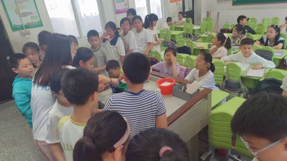 教學課堂還設置了垃圾分類現場體驗環節,每個孩子分發一張小卡片,上面印有垃圾圖案及名稱,孩子們需要根據垃圾的屬性投入相應顏色的垃圾桶模型。在分類投放過程中,孩子們有序排隊,仔細思考后在對應的垃圾桶模型內投入自己的卡片,這也是對團隊宣講效果的驗收。