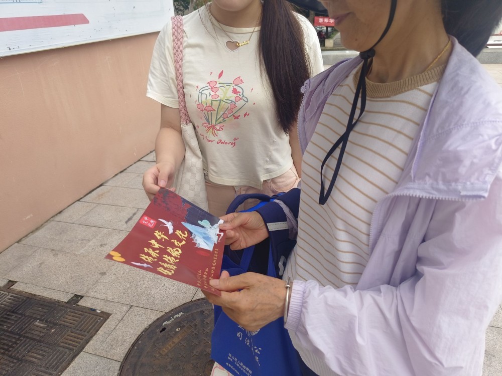 實踐隊員手持宣傳冊,如同承載著千年智慧的使者,穿梭在社區的街頭巷尾。他們的臉上洋溢著青春的光彩,眼中閃爍著對中華文化的熱愛與自豪。宣傳冊上,圖文并茂,展示著中華文化的瑰麗多彩,從古典詩詞的韻味,到傳統節日的熱鬧,再到民間工藝的精湛,無不讓人驚嘆于中華文化的博大精深。他們穿梭于社區的街頭巷尾,將這些蘊含著傳統文化精髓的材料遞送給每一位路過的居民。這些宣傳單不僅美觀大方,而且內容豐富,讓居民們在輕松愉快的氛圍中了解到了更多關于中華文化的知識。在這個夏日的午后,學生們用他們的熱情和行動,將中華文化的種子播撒在社區的每一個角落,讓這份古老的文化在新的時代里綻放出更加璀璨的光芒。
