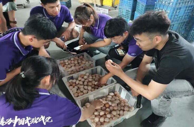 (圖為7月12日,揚州大學廣陵學院輔導員浦江寬和夢想“鄉”約團團員分揀雞蛋。徐蕓供圖)