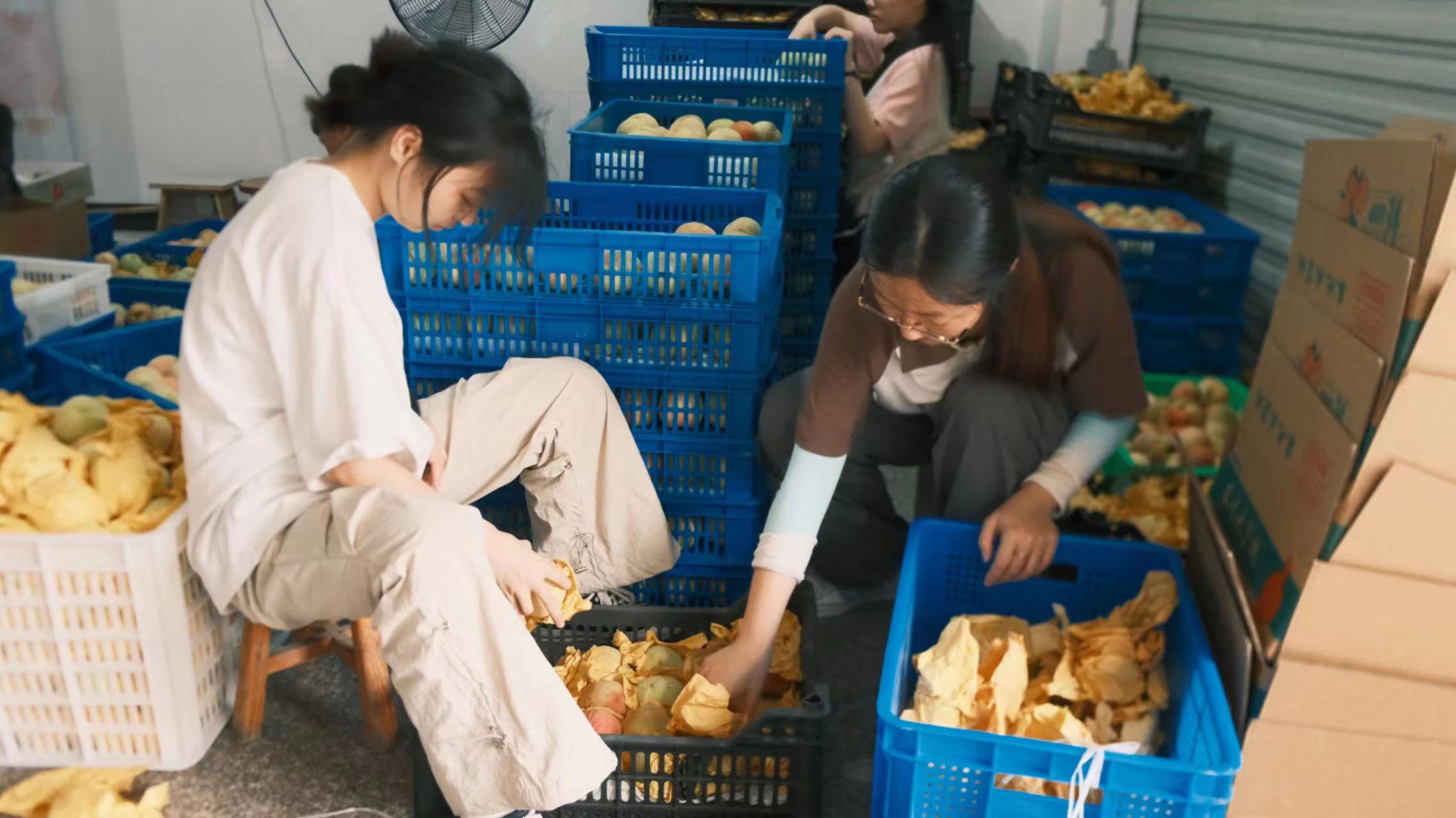 圖為團(tuán)隊(duì)隊(duì)員在分揀水蜜桃。多彩大學(xué)生網(wǎng)通訊員 林心怡 攝