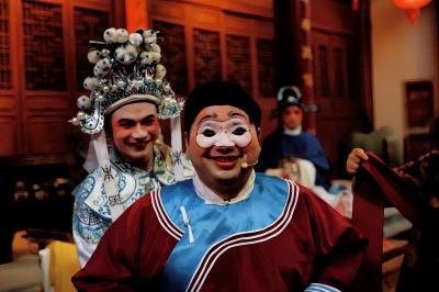 下午4點,天空下起蒙蒙細雨。參演成員早早集合在吳氏大宗祠,化妝、吃飯、彩排……“抬頭,一、二、三”,化妝師仇澤堯拿著粉撲在主演臉上按了三下,一個栩栩如生的丑角便誕生了。“你們今天算是來巧了,九華山政府為了打造老田村古村落,建造了一個九華戲苑。我們每周五都會來這兒表演,免費為游客和老百姓帶來黃梅戲的文化大賞。”