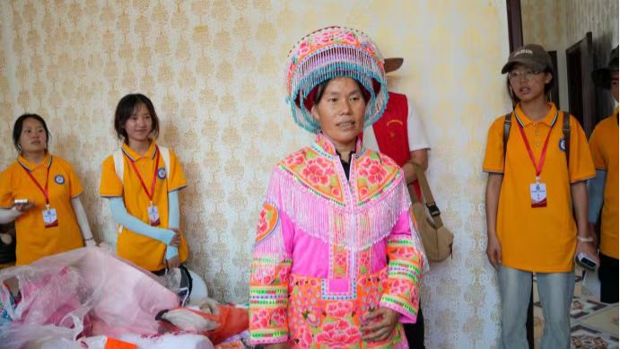 圖為苗族刺繡傳承人給實踐隊隊員展示他們的服飾。中國青年網通訊員 王菘澤 攝