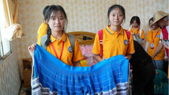 圖為實踐隊隊員展示純手工制作的苗族圍裙。中國青年網通訊員 王菘澤 攝