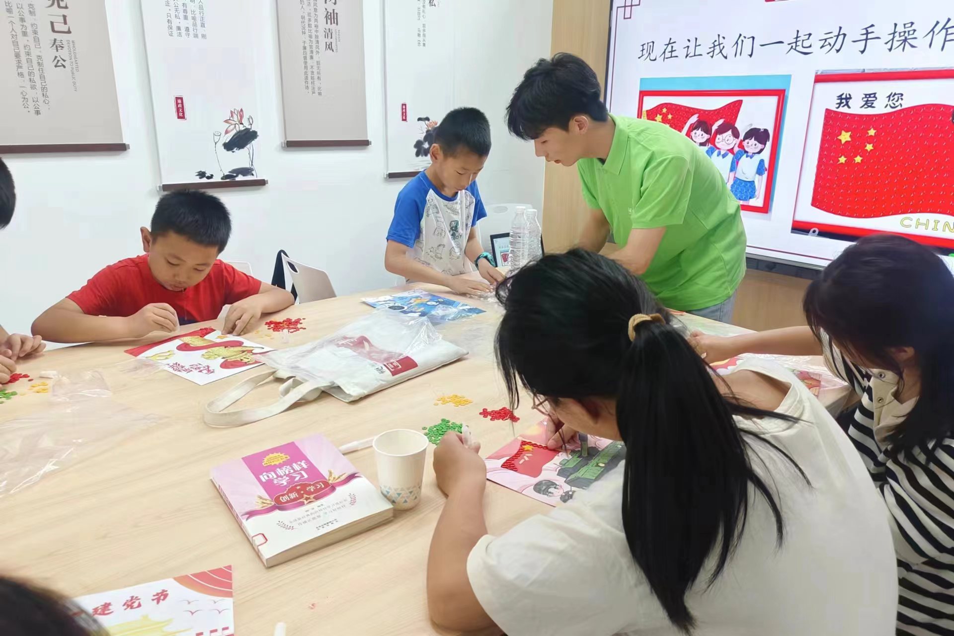 支教隊(duì)員通過理論講解,播放制作視頻并進(jìn)行手把手指導(dǎo),開展了趣味十足的手工課堂。相應(yīng)地,為進(jìn)一步厚植小朋友們的愛黨愛國(guó)情懷,引導(dǎo)小朋友們扣好人生的第一粒扣子,支教團(tuán)將愛國(guó)主義融入其中。紐扣畫內(nèi)容包括天安門、華表,八一建軍節(jié)和七一建黨節(jié),以此將民族自豪感和愛國(guó)主義情懷根植于小朋友們內(nèi)心的沃土之中。