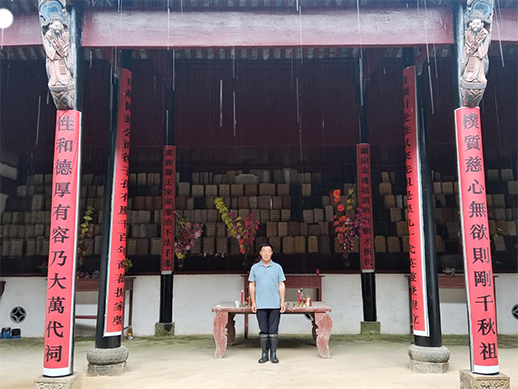 圖為汪正文先生在祠堂祭臺的留影 通訊員 濮素 攝