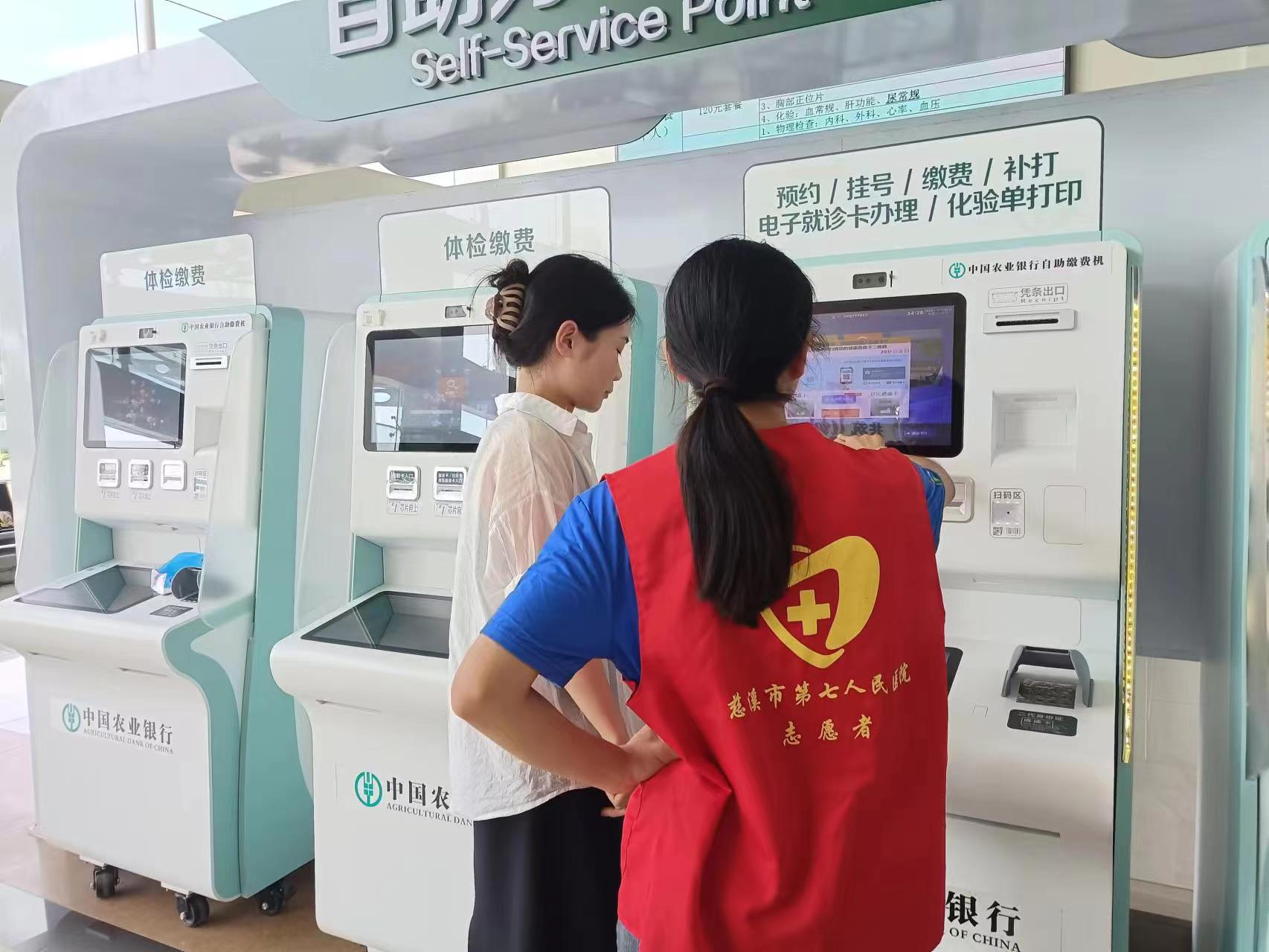 圖二志愿者協(xié)助患者使用機器查詢、取號