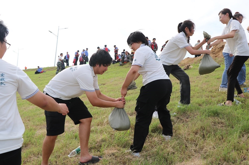 在了解到東西湖區東山辦事處將于今日下午舉行防汛演練后,團隊本著將勞育與實踐相結合的想法,積極地參與到了演練之中。團隊成員在烈日中,與當地工作人員一同上堤,通過鐵鍬的揮動,將一捧捧沙土平穩地裝入沙袋之中,被填滿的沙袋通過人員之間的傳遞,順利到達防汛前線。在演練的過程中,團隊成員學到了更多跟防汛有關的知識,也通過勞動鍛煉了自己的實踐能力。