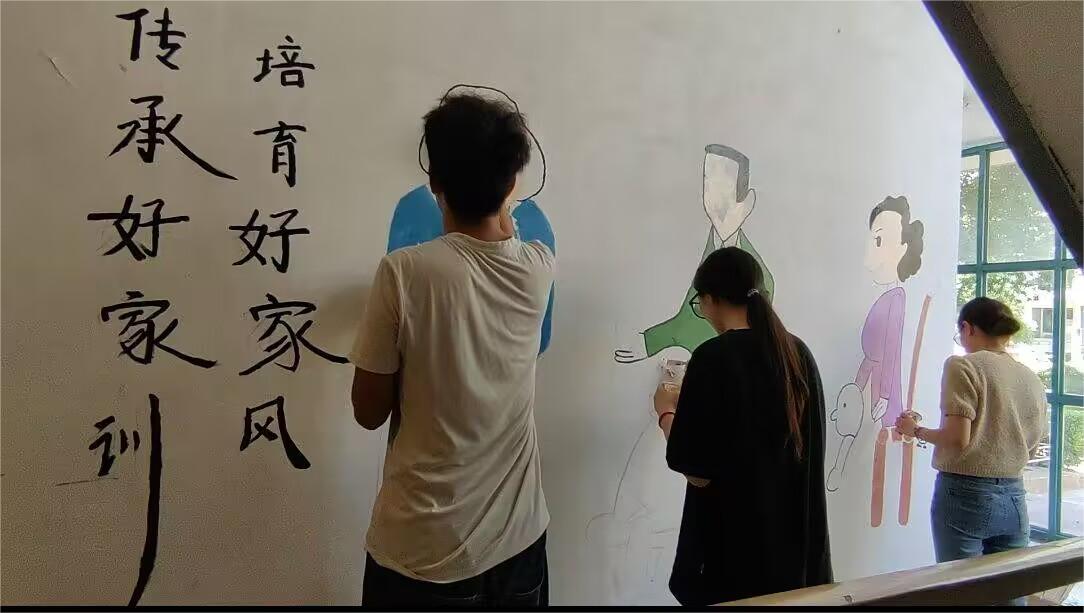 第二幅墻繪以“傳承好家訓(xùn),培育好家風(fēng)”為主題,由隊長王喆,隊員林潤杰和張文超合作完成。這幅墻繪通過描繪四個不同年齡階段的人物形象,展現(xiàn)了家庭生活中的溫馨場景。希望通過這幅墻繪傳遞良好的家風(fēng)和家訓(xùn)。良好的家訓(xùn)和家風(fēng)能夠促進家庭內(nèi)部的和諧,這種和諧氛圍也會延伸到社區(qū)層面,促進鄰里之間的友好交往,減少矛盾和沖突,營造溫馨和諧的社區(qū)環(huán)境。