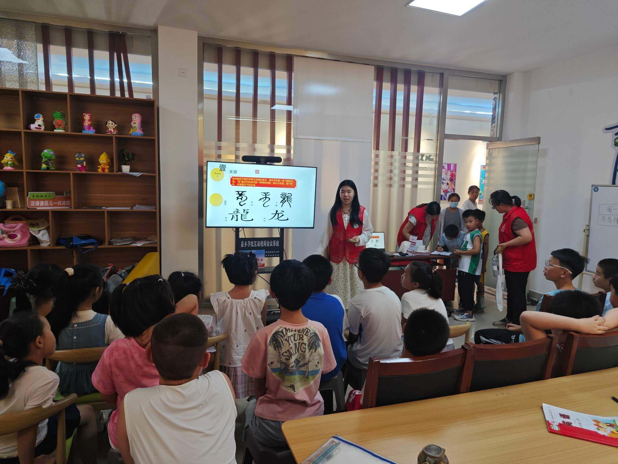 課程正式開始,授課人張寧宇首先用“龍”字的甲骨文引出話題,引導著孩子們猜測這個字的含義,孩子們踴躍回答,積極猜測,在老師耐心的引領下,他們終于成功得到了答案,龍的神秘傳說也在他們眼前娓娓道來,孩子們的小臉上滿是對龍的好奇以及對知識的渴求,中華傳統文化的魅力在孩子們的心中埋下了深深的種子。