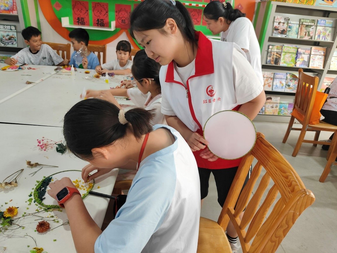 在這七天里,實踐隊的活動豐富多樣。在十堰市圖書館,在7 月 5 日的“十圖少年小課堂”志愿服務活動崗前培訓結束后,志愿者們與小朋友們一同歸還借閱書籍、維持秩序和整理書架。在文化傳承方面,志愿者們前往鍛造新村與空巢老人一同完成扎染,不僅豐富了老人們的生活,也傳播了傳統文化的魅力。除此之外,志愿者們也分別于7 月 4 日和 6 日,在柳林新村社區和十堰市圖書館進行非遺文化團扇的宣講與制作。
