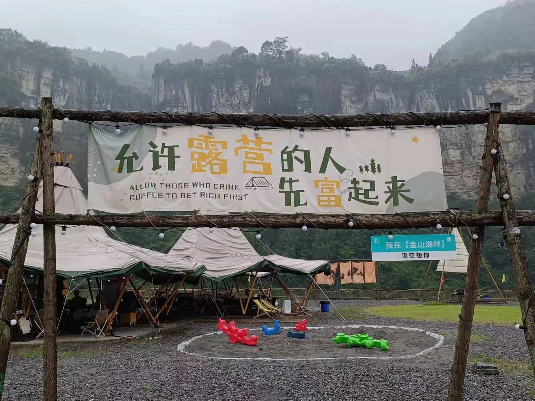 雨中仙境中的溫馨體驗與豐富活動 實踐隊員們抵達金山湖畔露營基地時,正值大雨傾盆。然而,走進露營基地的大門,映入眼簾的是一個溫馨的場景:游客們在棚下悠閑地休憩,雨中的金山湖更顯得別具風味。基地負責人熱情接待了實踐隊員,笑著說:“現在的金山湖如同云霧仙境,我們正身處這片仙境中。”的確,金山湖畔的美麗風景在晴天時尤為迷人,而雨中的湖泊則別有一番風情。