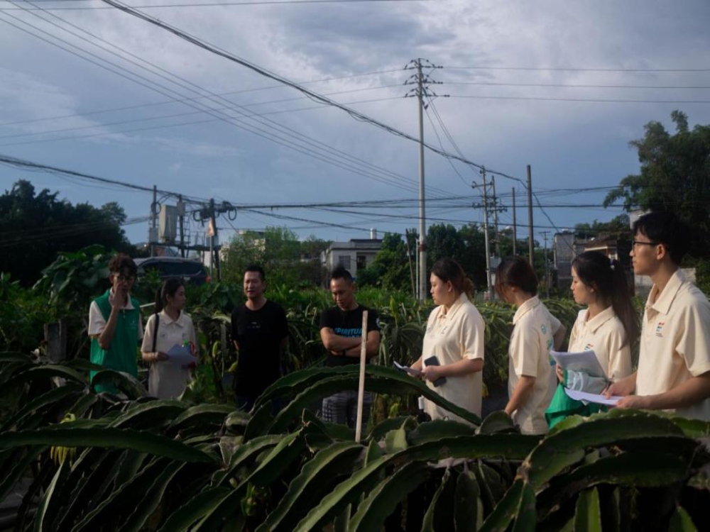 圖為火龍果果農(nóng)向團(tuán)隊(duì)成員講解火龍果產(chǎn)業(yè)園種植情況