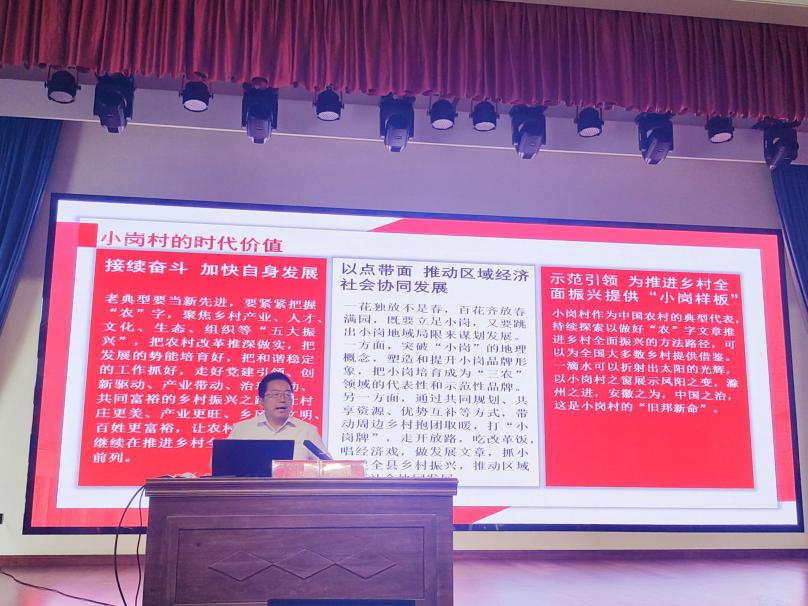 在接下來的環節中,李錦柱書記以“做好‘農’字文章,推動鄉村全面振興”為主題進行了授課。李書記通過分享自身的艱苦求學經歷,教誨青年學子珍惜新時代新機遇,用自己的知識和熱情為鄉村振興貢獻青春力量。同時,提出了小崗村“兩上兩下”,即“農產品上行,農民上行;城里人下鄉,要素下鄉”的鄉村振興新思路。團隊成員受益匪淺,紛紛表示要致力于學習科學文化知識,提高自身素質,為將來投身鄉村振興事業做好準備,為實現中華民族偉大復興的中國夢貢獻自己的青春力量。