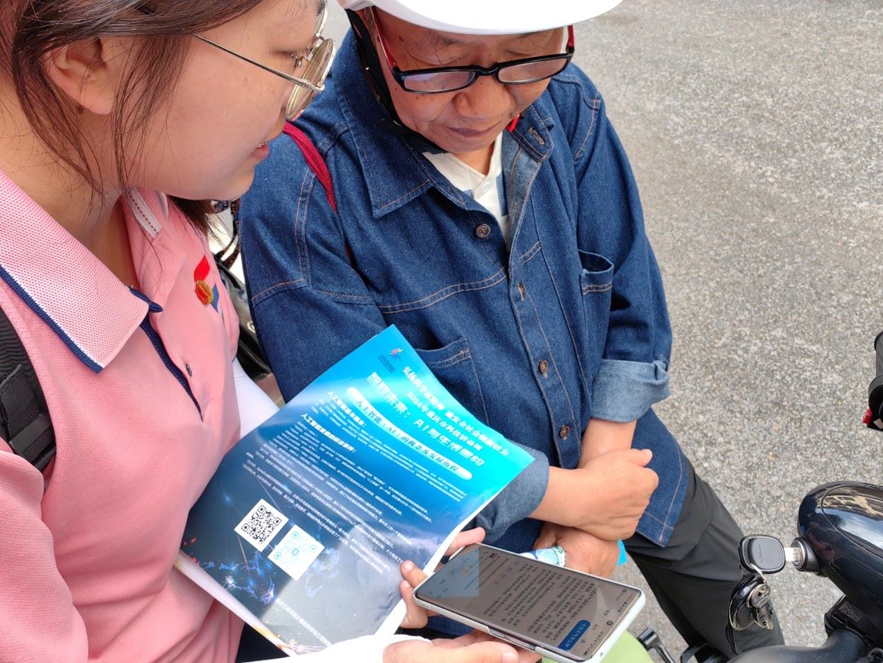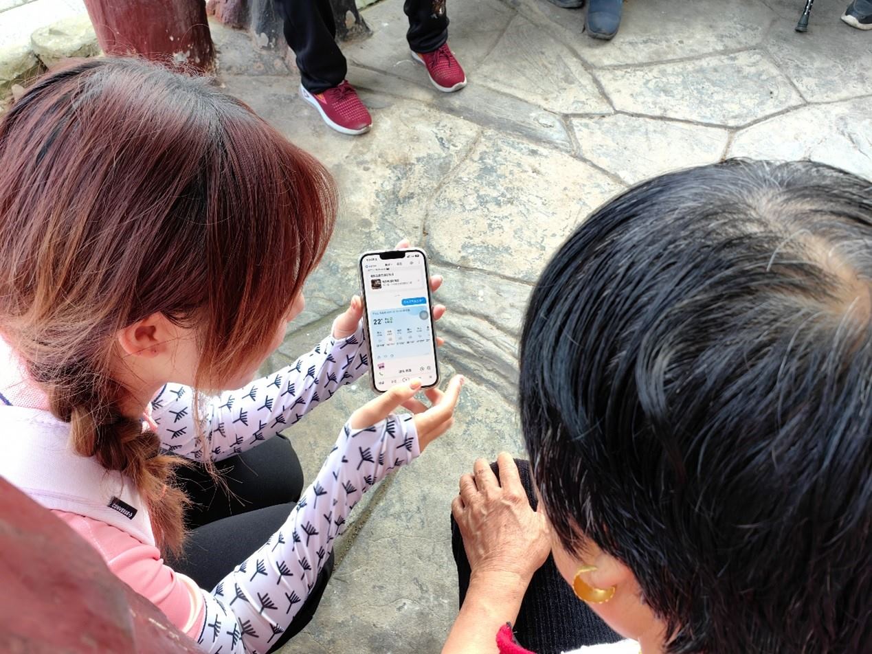 (圖為實踐團成員付盈盈為居民展示如何使用AI軟件查詢天氣 實踐團成員 羅雨 攝)