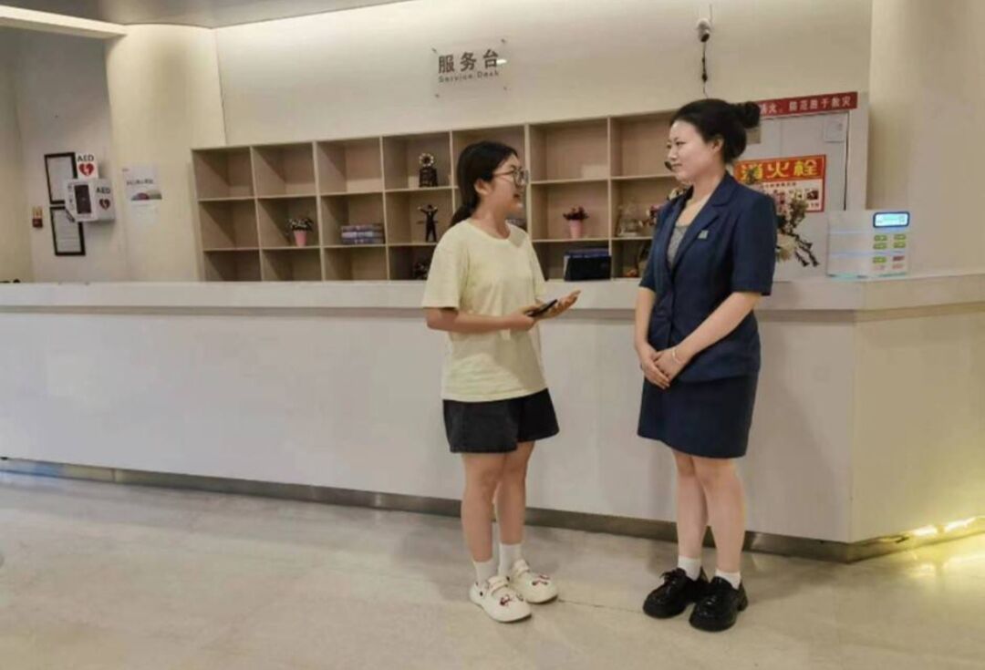 圖為實踐隊員與工作人員進行交談。中國青年網通訊員 蓋藝蔚 供圖
