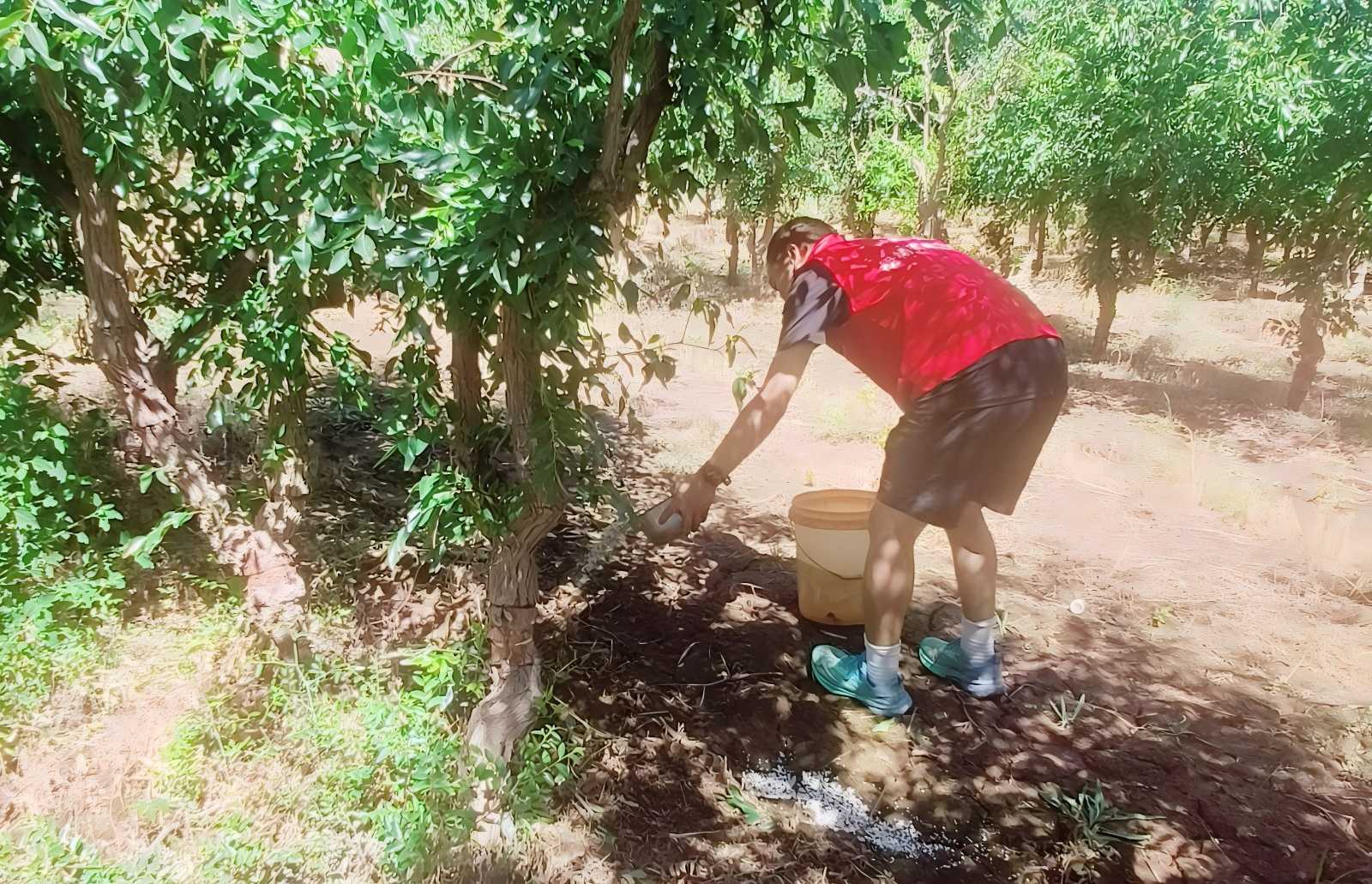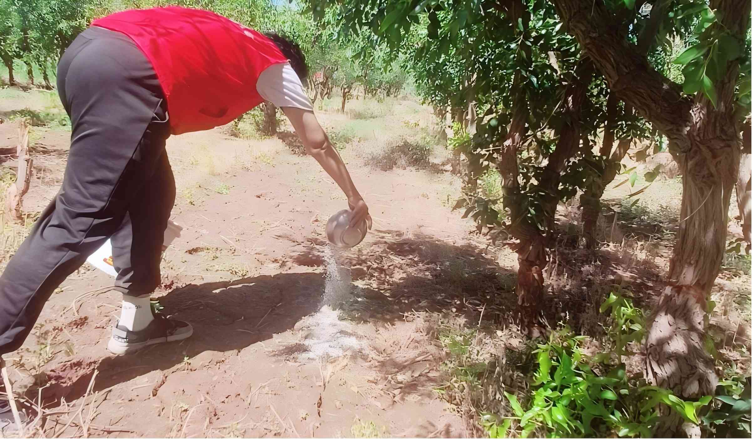 在李書記的帶領下,實踐團隊深入棗園,開始了傳統的施肥工作。隊員們挽起袖子用鐵鍬將肥料混合均勻,與當地村民并肩作戰。他們將有機肥料均勻地撒在每棵棗樹的根部,然后用泥土輕輕覆蓋,確保肥料能夠緩慢釋放,滋養每一寸土地。