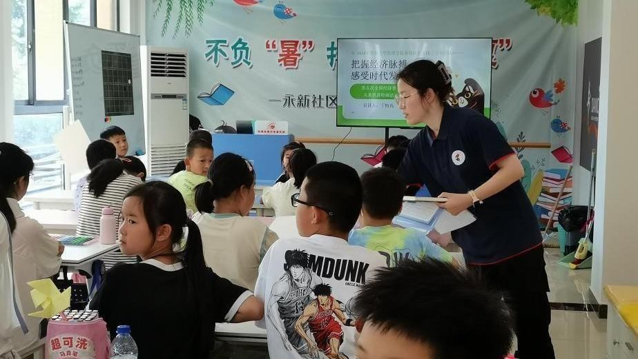 圖為團隊成員正在給暑托班的孩子們分發五經普宣傳單。通訊員 丁怡凡 供圖