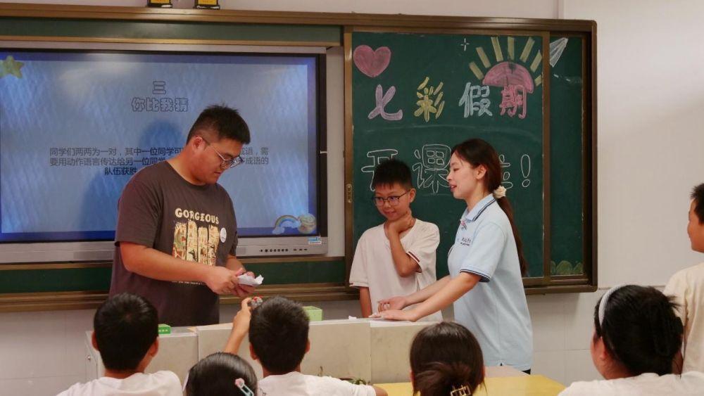 開班第一天,隊員們作為各班級帶班老師走進教室開啟七彩假期第一堂課,帶班老師著重強調(diào)了防溺水安全和交通安全問題。向孩子們介紹本次七彩假期內(nèi)容豐富的課程,包括古典舞、拉丁、美工、體育、心理、科學小實驗等,以及形式多樣的特色活動,包括制作回憶錄、積分拍賣會。