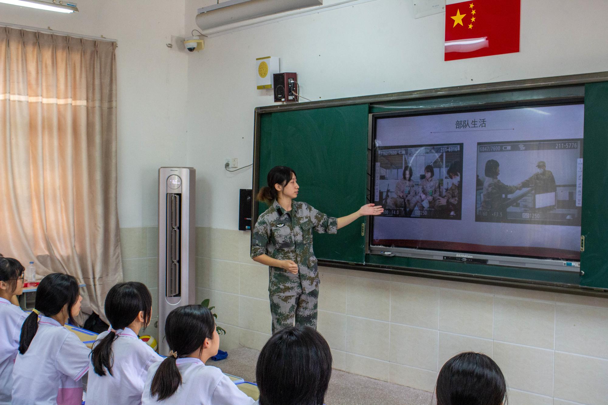 活動中,擔任教練員的福州大學實踐隊員童淅瑤,一名東部戰區第71集團軍的大學生義務退伍兵,與學生們分享了她的入伍經歷、訓練日常及部隊的文娛活動等。她以“參軍盡義務,戍邊衛國防”為主題,生動介紹了青年入伍的政策和軍旅生活的苦與樂。學生們表現出極高的熱情,積極與實踐隊員交流,紛紛表達了對軍隊生活的向往,愛國擁軍的種子在心中茁壯生長。