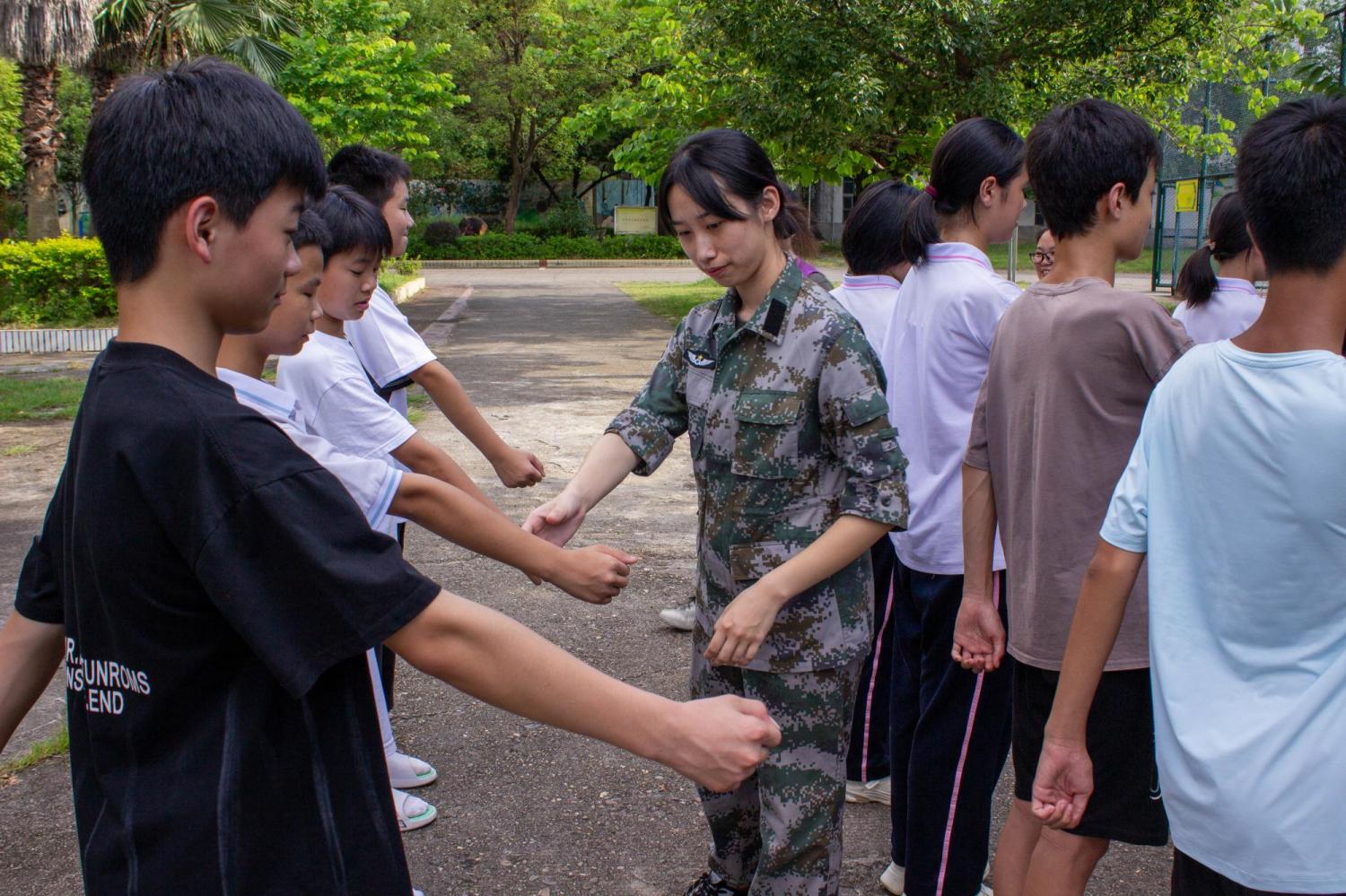 站軍姿、齊步走、正步走……各項動作訓練有條不紊,循序漸進。教練員不厭其煩的講解動作要領并做示范。在教練員的耐心指導下姿勢動作越來越標準,從抬手角度到跨步步幅,畬族小伙伴們姿勢標準,整齊劃一。烈日下,汗水浸濕了衣衫,學生的眼神卻愈發堅毅,彰顯出頂天立地的青年力量。