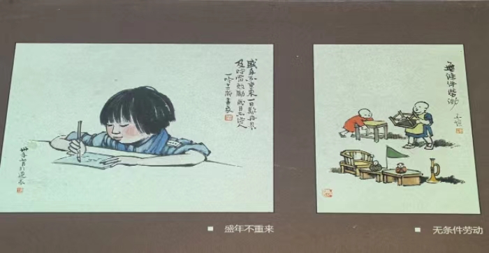 紀(jì)念館內(nèi)其二就是豐子愷漫畫館,實(shí)踐團(tuán)仔細(xì)觀賞了豐子愷先生的漫畫作品、文學(xué)作品以及各類珍貴文物。通過工作人員的生動(dòng)介紹,他們不僅了解了豐子愷先生的生平事跡和藝術(shù)成就,還深刻感受到了他對(duì)家鄉(xiāng)桐鄉(xiāng)的深厚情感與貢獻(xiàn)。豐子愷非常愛孩子,他的漫畫和散文中常常出現(xiàn)孩子的身影。他對(duì)待孩子純?nèi)灰黄瑴厝峥嘈,在院子里安置滑梯、沙坑等兒童游樂設(shè)施。在求學(xué)之路上豐子愷進(jìn)入杭州的師范學(xué)校,期間遇到了對(duì)他影響深遠(yuǎn)的恩師如夏丏尊和李叔同。李叔同曾贊揚(yáng)他的圖畫進(jìn)步快速,并鼓勵(lì)他以此為業(yè),豐子愷的漫畫創(chuàng)作始于偶然間的嘗試,并逐漸形成了自己獨(dú)特的藝術(shù)風(fēng)格,他的簡(jiǎn)筆畫首次公開發(fā)表后引起了廣泛關(guān)注,并被冠以“漫畫”之名。以此他在《舊話》中提到:“我的入師范學(xué)校是偶然的,我的學(xué)畫也是偶然的,我的達(dá)到現(xiàn)在的生涯也是偶然的。”無數(shù)的偶然促成了現(xiàn)在的豐子愷,抗日戰(zhàn)爭(zhēng)期間,他雖然疲于奔命,但仍堅(jiān)持用畫筆勾勒戰(zhàn)時(shí)百態(tài)。他的畫作中既有憤懣諷刺之作也有悲憫激勵(lì)之作展現(xiàn)了深厚的愛國情懷。豐子愷的一生充滿了藝術(shù)追求和人文關(guān)懷,同時(shí)與桐鄉(xiāng)緊密相連,他的藝術(shù)作品中充滿了對(duì)家鄉(xiāng)風(fēng)土人情的描繪與贊美,為桐鄉(xiāng)的文化發(fā)展留下了寶貴的財(cái)富。