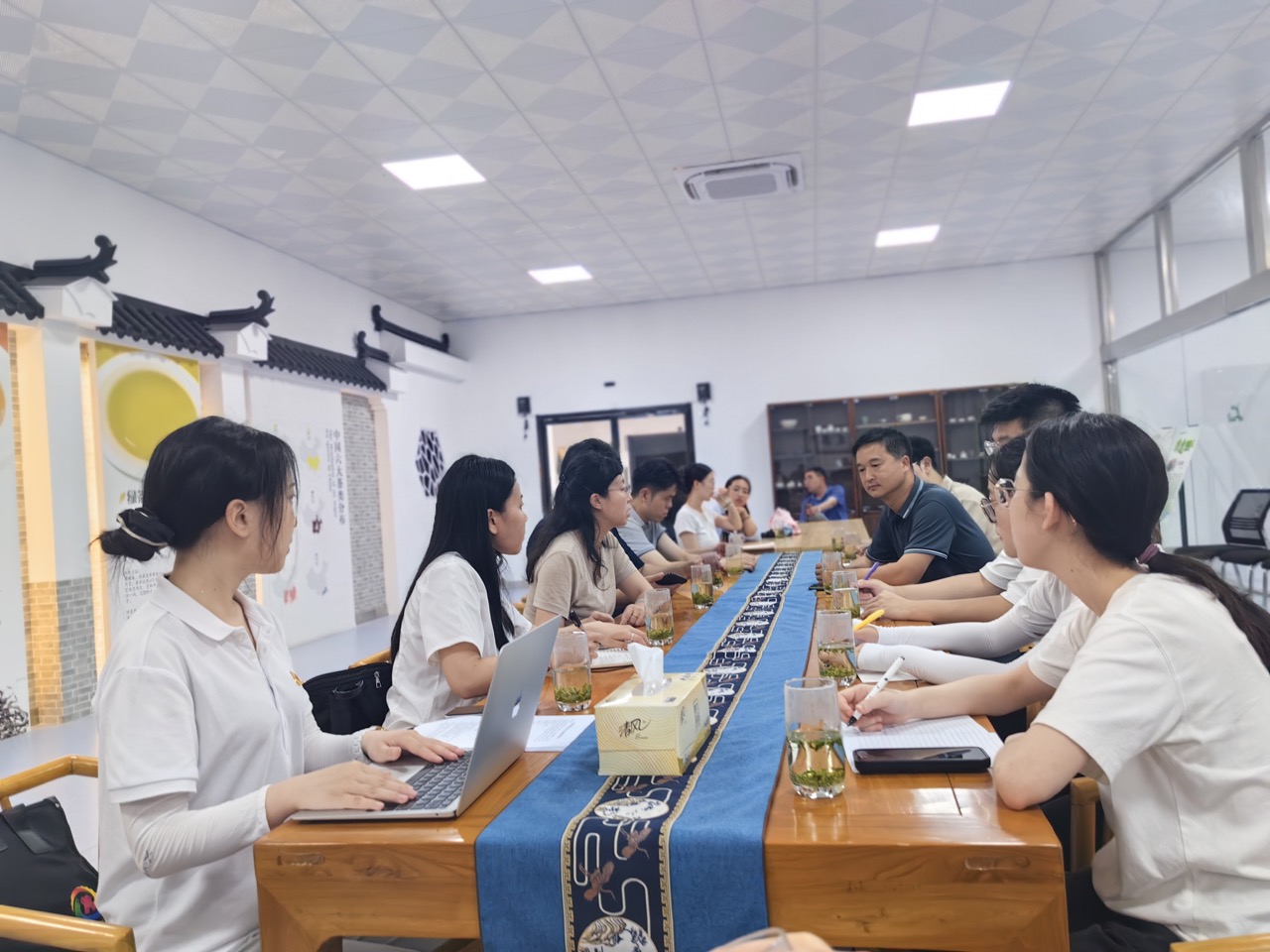 二、深入訪談:提煉“三色融合”發展模式 在實地參觀的基礎上,實踐團隊與葉紅兵書記進行了深入的訪談。訪談中,葉書記詳細介紹了雨山茶場在推動茶旅融合、實現鄉村振興方面的探索與實踐。從一片葉子,到一種文化、一個產業,盱眙雨山茶“做媒”,以旅游為引、以產業發展為基,構建茶產業、茶旅游、茶文化等協調發展的現代茶產業體系,成功走出了一條“以茶促旅、以旅帶茶、茶旅共融”的發展之路。這種發展模式不僅促進了茶產業的轉型升級,還帶動了周邊鄉村的經濟增長和生態環境改善。通過探討與溝通,團隊聚焦“三色融合”發展模式,總結提煉出依托雨山茶文化講好品牌故事的同時招商引資,通過做大做強茶旅融合,深刻踐行習近平總書記“兩山”理論,從而有效促進產業的轉型升級。