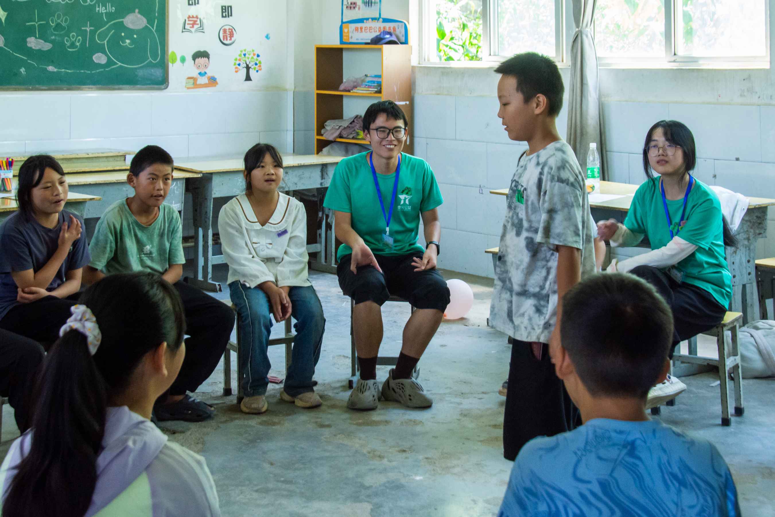 活動伊始,志愿者們在龍井小學的門口通過擊掌的方式熱烈歡迎參加夏令營的孩子們,每位孩子都收到了一個獨特的氣球以及寫有自己姓名的胸針作為開營禮物。在志愿者的合理安排下,孩子們有序走到操場上,并在志愿者提前擺好的板凳上就座,靜待開營儀式的開始。