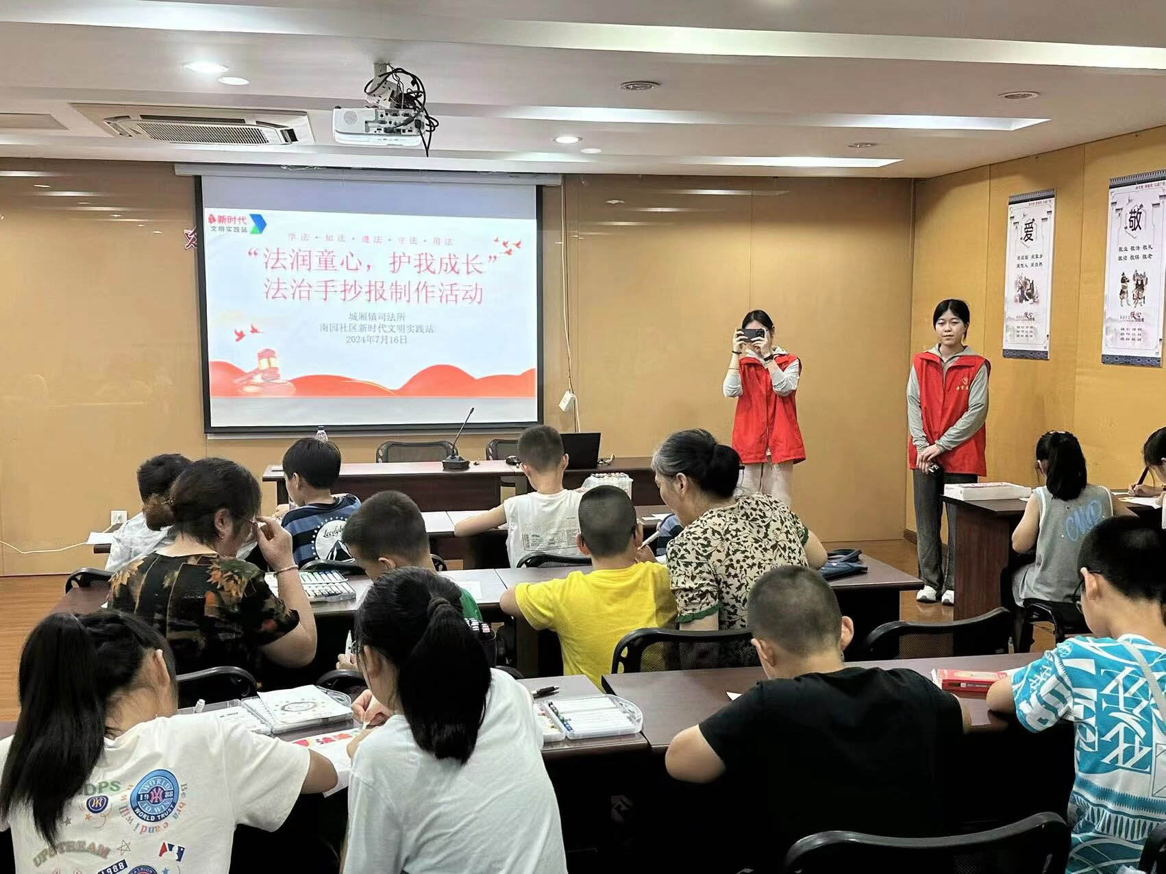 為普及法律知識,培養法治觀念,太倉市南園社區于7月16日下午開展了“法潤童心,護我成長”法治宣講及手抄報制作活動。